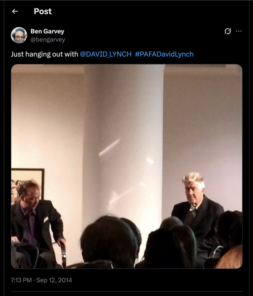 In person, David was the sweetest, most normal, most hand-shaking-golly-gee Grandpa. Combine Woody and Coach from Cheers, that’s him. The audience was full of freaks, but David was the most normal and genuine person I ever saw in my life. His movies aren’t perfect but they spoke to me at formative times. Twin Peaks is my favorite show.